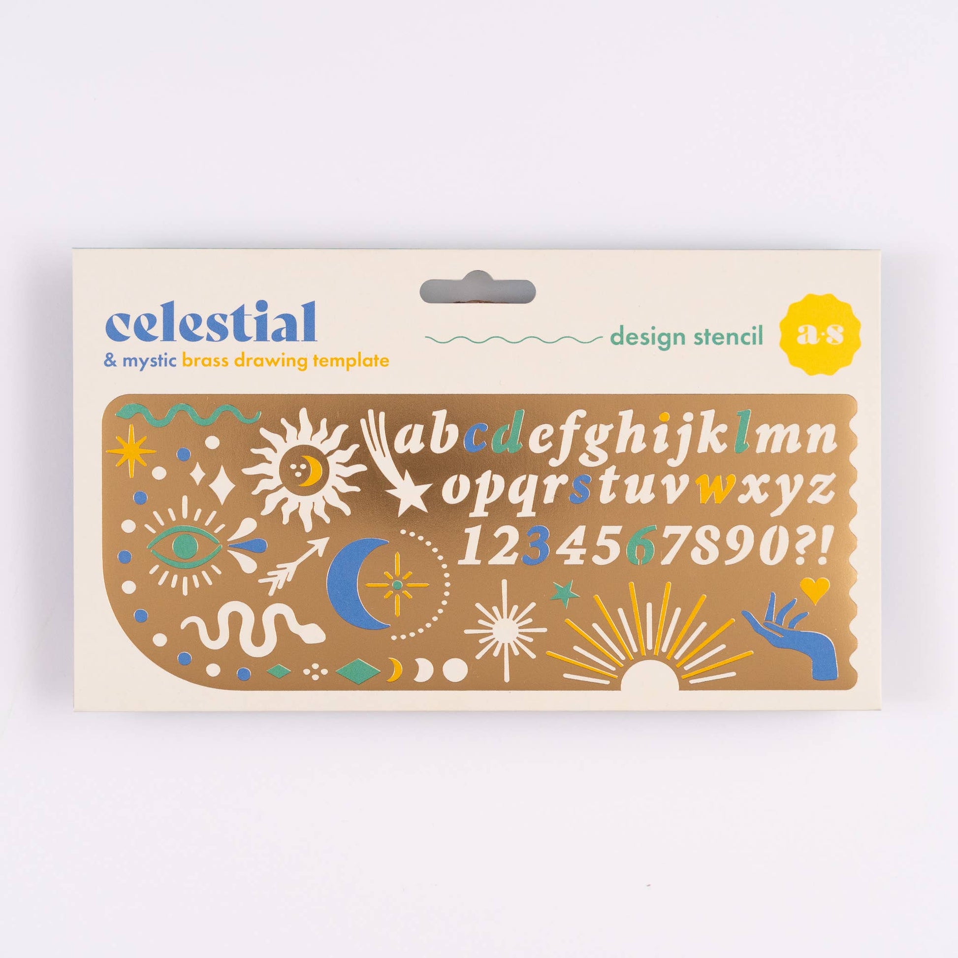Use this Celestial design to make your own stationary, embellish journals, notebooks, letters, and more with this brass drawing template. The stencil can be used with felt tips, pencils, or even paint - it is water-resistant and can be easily cleaned. Containing a constellation of mystical shapes, this stencil lets you create endless celestial designs by combining stars, moons, suns, and cosmic symbols into your own illustrations. Stencil repeat patterns, design glowing borders, craft magical motifs, and personalize with text of your choice. Unleash your imagination and let this celestial-themed stencil be the inspiration for the next craft or journaling project. Contents: Brass Design Stencil, 7.5cm x 10.5 cm Packaging Dimensions: 21cm x 16 cm, with instructions, including pattern ideas Made from corrosion-resistant brass. Designed and shipped from the UK. Made in China.