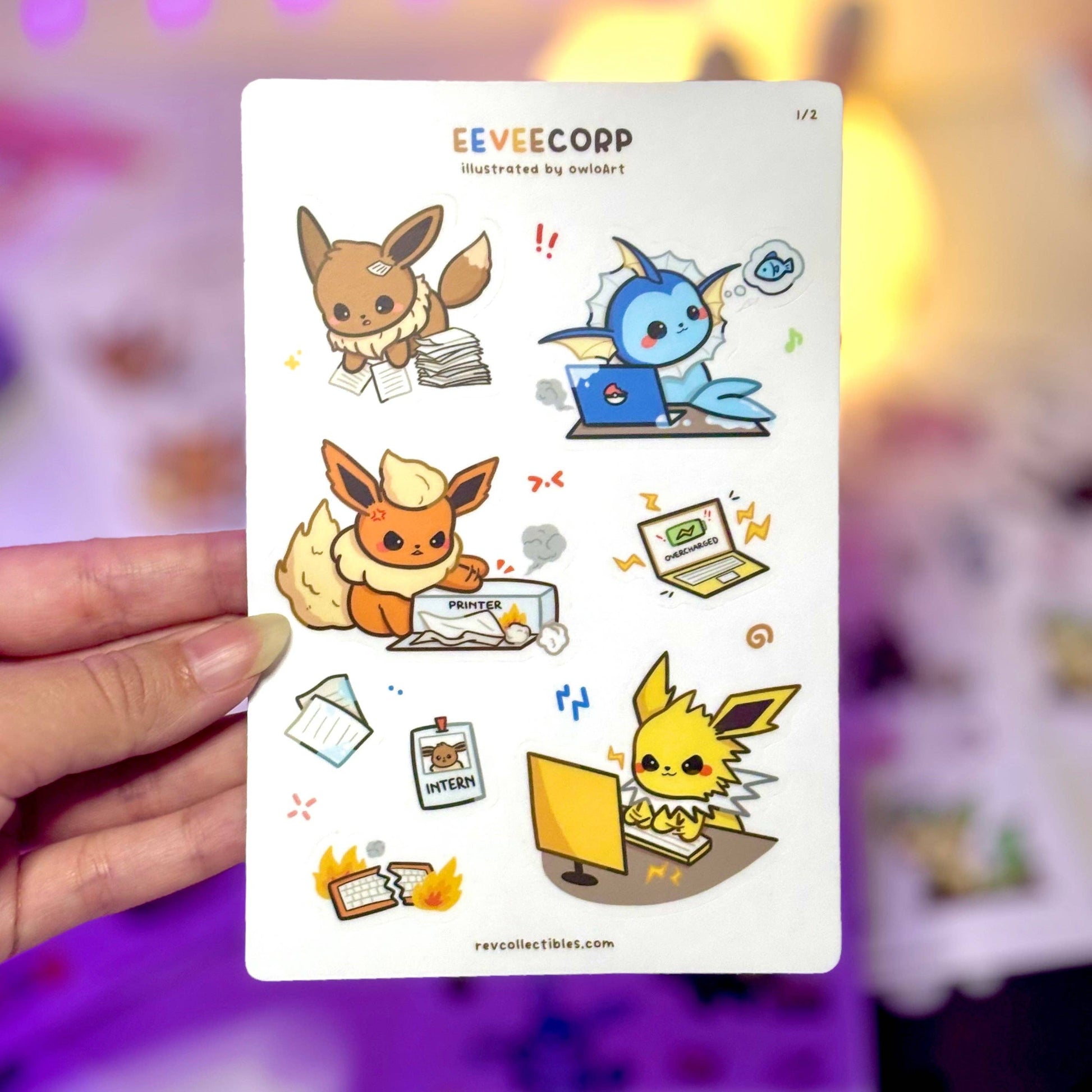 Get ready to tackle corporate chaos with the EeveeCorp Waterproof Sticker Sheet! Featuring adorable evolutions, these stickers capture the hilarity of office life: from drowning in paperwork to waging war on the printer, and even decking out office supplies with tiny bow ties. Perfect for planners, notebooks, and laptops, these stickers bring relatable humor and cuteness to your workspace. Material: waterproof matte sticker. Sheet Size: 4x6 inches. Please note that color may differ slightly from how it appears on your screen due to varying monitor settings.ย