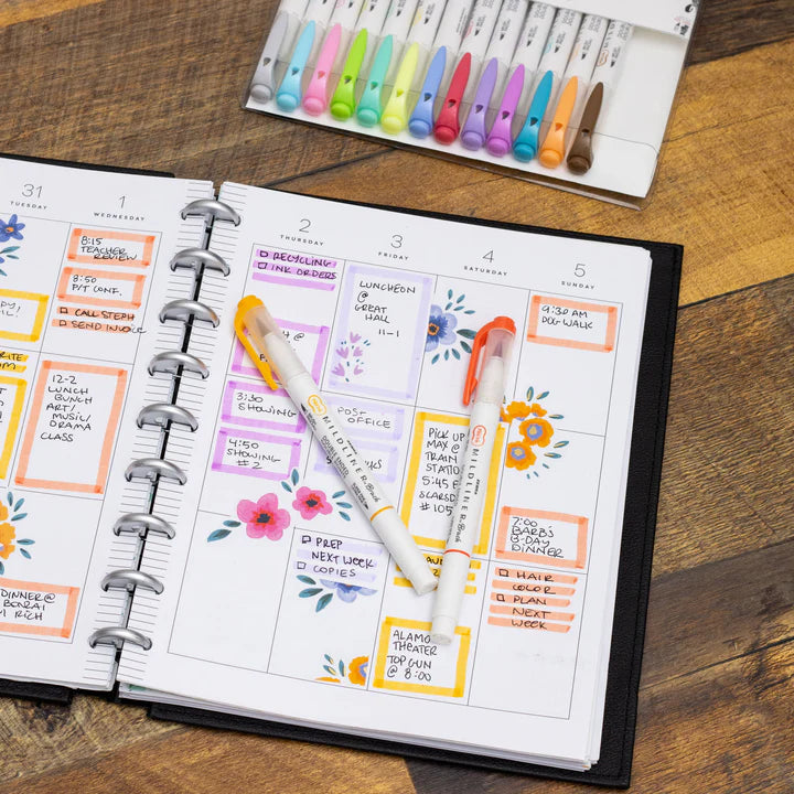Make a striking impact in mild color with Zebra’s Mildliner Brush Pens! Conveniently double-ended, these colorful no-bleed marker pens feature a paint brush-like tip and a fine marker tip for all hand lettering applications. The medium brush tip helps you achieve fluid, elegant strokes with minimal effort for creative headers and titles, and the fine bullet tip makes it easy to create predictable, clean lines. Zebra’s Mildliner Brush marker features water-resistant pigment ink that doesn't bleed through; the unique color shows up softly on paper and is excellent for layering and blending. With its acid-free, archival quality ink that glides smoothly across paper, the no-bleed Mildliner Brush is the ideal choice for bullet journaling, scrapbooking, and other creative applications. From elaborate titles and task lists to calendars, monthly goals, and mood trackers, the Zebra Mildliner Brush set will enhance your page designs and allow you to create your artistic project exactly the way you envisioned it. Housed in a white barrel with minimal, clean design, and a convenient pocket clip that indicates the highlighter's color, the Zebra Mildliner Brushes will complement your set of Zebra Mildliner Creative Markers. Whether you are using the Zebra Mildliner Brushes for your bullet journal, planner, hand lettering or studying for your next exam, it will help you express yourself in a unique way!